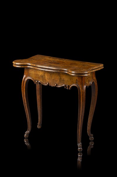 Tavolo da gioco lastronato in noce con piano apribile intarsiato a volute di forma sagomata. Fascia intagliata a riccioli, gambe mosse (cm 76x82x42) Veneto, secolo XVIII (lievi difetti)