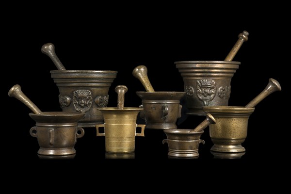 Collezione di sette mortai con pestelli, alcuni decorati in rilievo a festoni. Secolo XVII/XVIII (difetti)