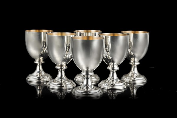 Lot 433 | Gruppo di sei calici in argento a corpo liscio con interno in vermeille. Argent