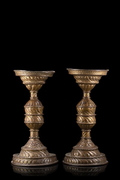Coppia di portaceri in rame sbalzato, dorato e decorato a motivo concatenato. Veneto, secolo XVI (h. cm 34,5) (difetti)