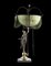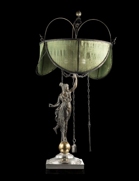 Lampada fiorentina in argento, fusto con figura di vestale a tutto tondo che sorregge porta olio decorato a mascheroni con tre accessori appesi alle catenelle. Paralume in tessuto verde. Stato Pontificio, secolo XIX. Marchi dell'argentiere abrasi (h. cm 46) (difetti)
