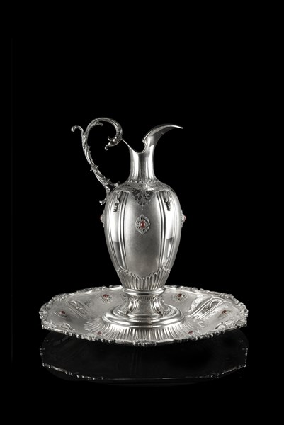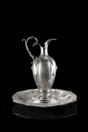 Brocca con piatto esagonale in argento sbalzato e cesellato, decorato a motivi
