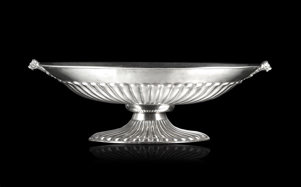 Alzata in argento di forma ovale decorata a baccellature. Prese a guisa di teste ferine su volute fogliate. Piemonte, seconda metà secolo XX. Argentiere Ricci e Cesa (cm max 32) (g 571 ca.) (lievi difetti)