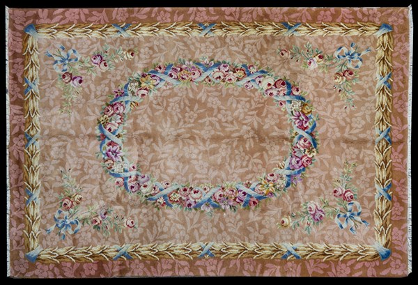 Decoro francese di ispirazione Aubusson con ghirlanda di rose e fiori policromi avvolti da un nastro in tonalità di azzurro sopra un campo color rosa antico decorato da fiori sparsi in tonalità più chiara. Mazzolini di rose agli angolari, legati da asole in nastro azzurro. Bordura ad imitazione di cornice di quadro formata da foglie nei toni del tabacco, nocciola, beige e bianco, legate da nastro nelle tonalità di azzurro. Bordura esterna a fondo cammello con fiorellini rosa (cm 350x248) (lievi difetti)