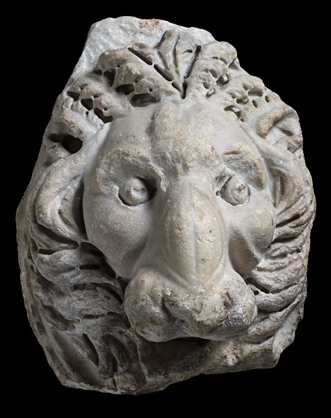 Bocca di fontana in marmo raffigurante testa leonina (h. cm 40) Secolo XVII (difetti e mancanze)