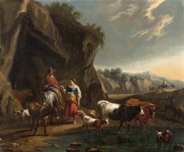 Bambocciante romano del secolo XVIII Paesaggio con contadini e armenti Olio su
