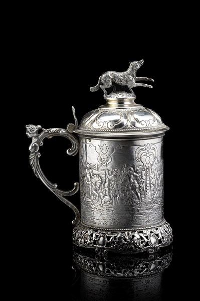 Tankard in argento cesellato a scene di caccia, presa del coperchio a figura di
