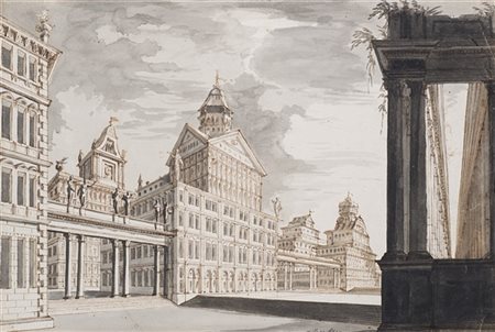 Fabrizio Galliari (attr.) Grande piazza con palazzo e colonnati laterali Penna
