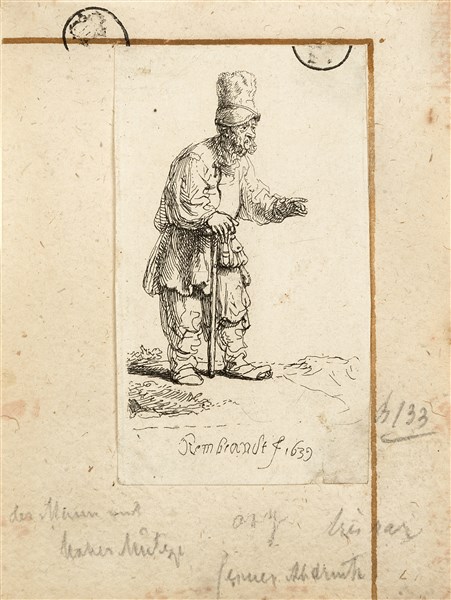 Rembrandt Harmenszoon van Rijn Contadino con grande cappello appoggiato a un bas