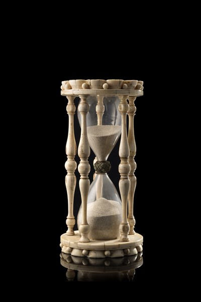 Manifattura del secolo XIX. Clessidra in avorio con basi scolpite a fiori e col