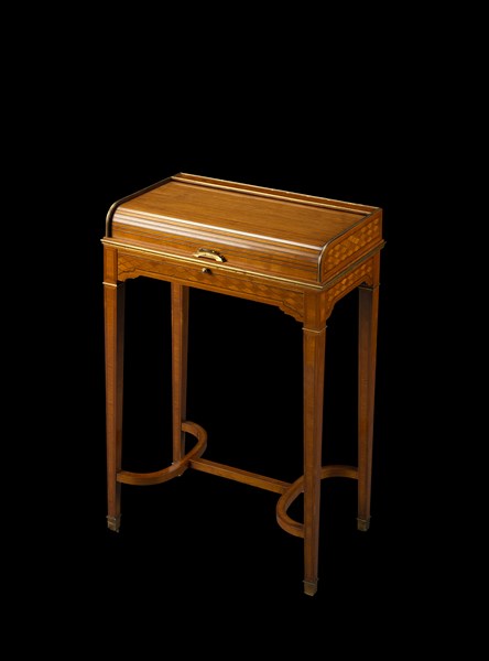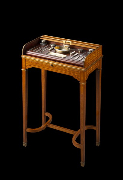 Tavolo porta necessaire lastronato e filettato in legni vari con antina a saracinesca celante attrezzi da manicure in argento marcati Gustav Keller, gambe rastremate riunite da traverse e munite di scarpette. Francia, secolo XIX (cm 45x71x28)