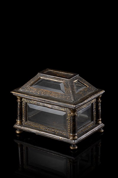 Cofanetto con coperchio di forma trapezoidale, in legno ebanizzato decorato a fregi e capitelli dorati e volatili in policromia. Montanti e piedi torniti. Secolo XVI (cm 16,5x13,5x12) (pannelli in vetro di epoca posteriore, difetti)