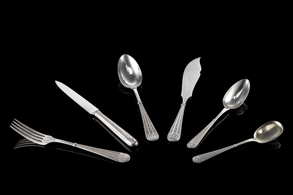 A silver flatware set composed of: twentyfour forks, twelve spoons, twelve knieves, twelve fish knieves, twelve tablespoons and twelve ice cream spoons. Paris, 19th Century. Silversmith Cardeilhac (minor defects)