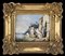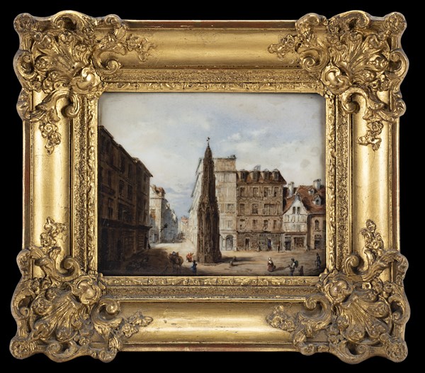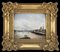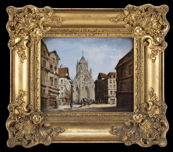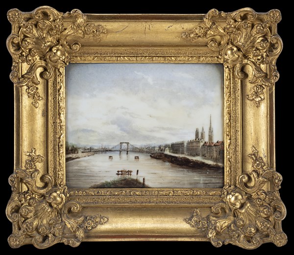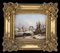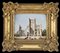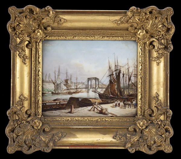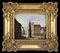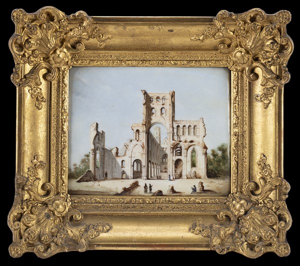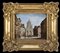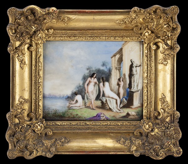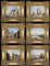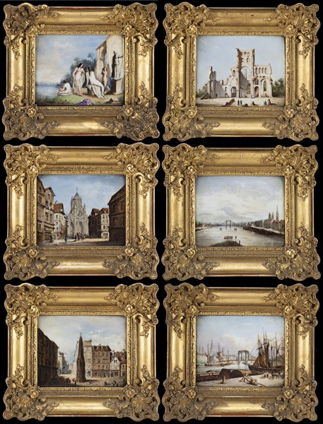 Gruppo di sei piastrelle in porcellana decorate con scorci di città europee, rovine e donne al bagno, in cornici dorate. Fine secolo XIX (cm 11x15) Alcune inscritte al retro (difetti)