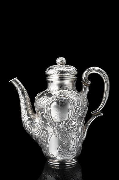 Caffettiera in argento a corpo cesellato a volute fogliate e fiori. Ansa a dopp