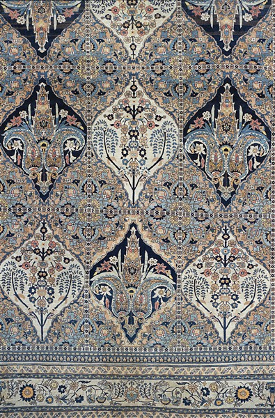 Disegno a giardino, le riserve, a fondo bianco e blu, sono decorate con boteh e cipressi imperiali. Il campo, color camoscio, è diviso in riquadri da un'elegante greca a fondo bianco e decorato con fiori a stella azzurri. Molteplici bordure, la principale a fondo beige è decorata con motivo a meandro di fiori e rami. Due piccole bordure secondarie sono decorate con pesciolini in contrapposizione nei toni del beige e nocciola su fondo blu notte (cm 548x334) (difetti)