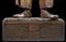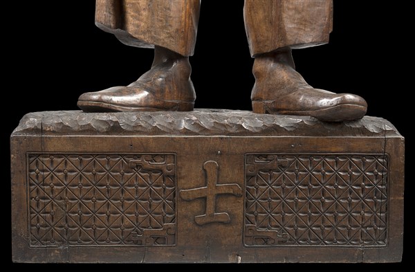 A 'nanmu' wood sculpture of a scholar, reading a book with focused expression, wearing a blouse and trousers, the base decorated with geometric motifs, carved with a central character 'shi' corresponding to 'scholar, official'