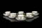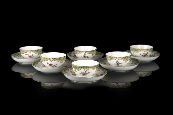 Manifattura di Cozzi, secolo XVIII. Gruppo di sei tazze con piattini in porcell