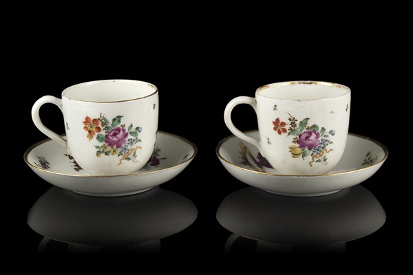 Manifattura di Antonibon, Nove, Bassano, secolo XVIII. Coppia di tazze con piat