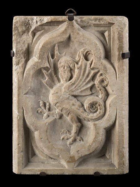 Antica formella in marmo di forma rettangolare scolpita in altorilievo ad animale fantastico entro cornice polilobata (cm 70x58) (difetti e mancanze)