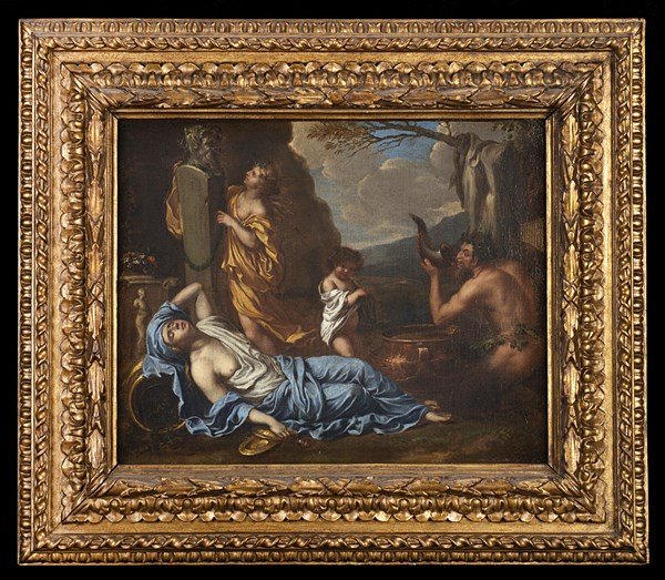 Scuola francese del secolo XVII Infanzia di Bacco Olio su tela cm 36x45,8 In c