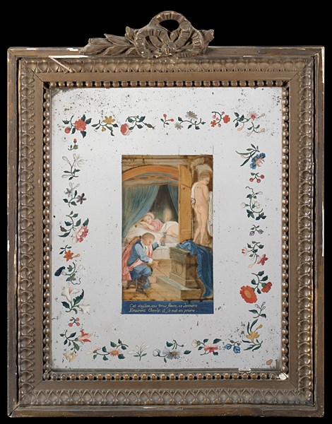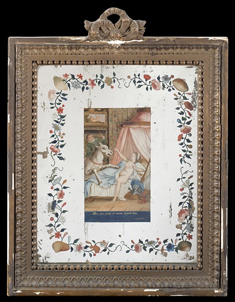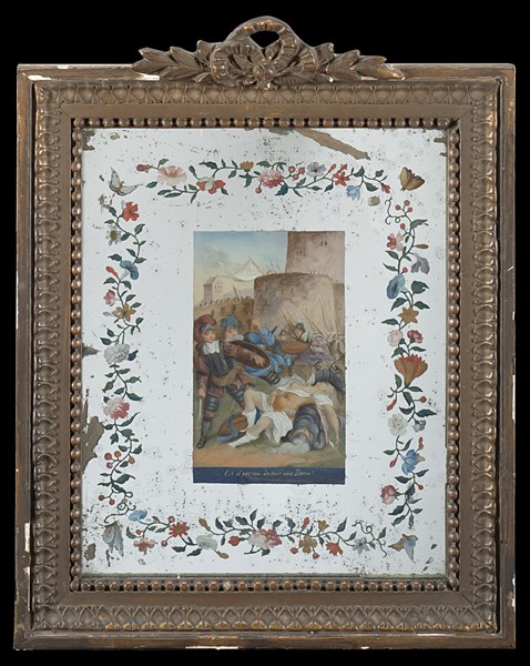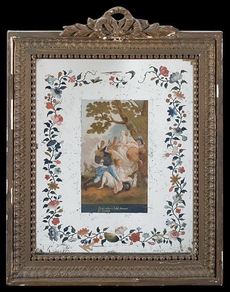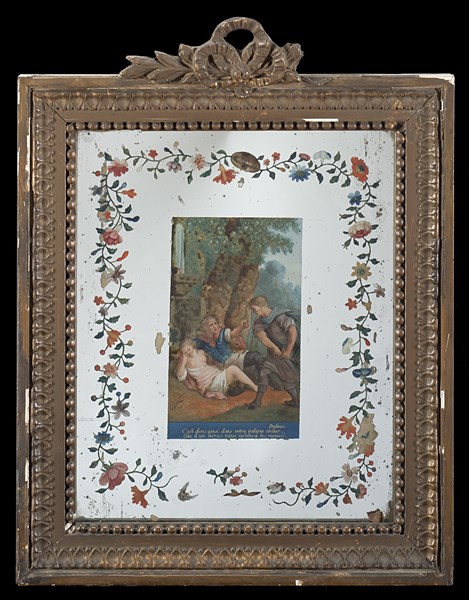 French art, 19th century "Genre scenes" five painted glasses on mirrors. Framed (cm 27x22) (defects and restorations)