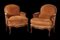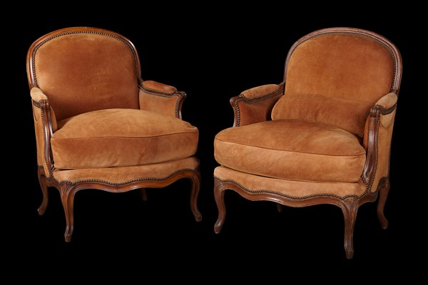 Coppia di poltrone in noce con braccioli mossi e scanalati, fasce e gambe sagomate terminanti a riccioli. Secolo XVIII. Rivestite in velluto