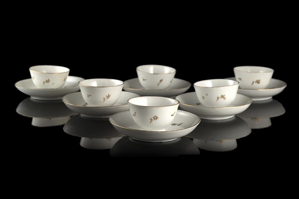Manifattura di Antonibon, Nove, Bassano, secolo XVIII. Gruppo di sei tazze con piattini in porcellana decorati a dorature con fiori stilizzati. Marchi di fabbrica alla base (difetti e restauri)