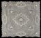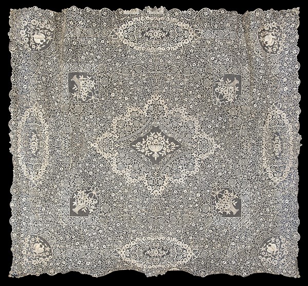 Lavorato al tombolo con tecnica detta "di Cantù" con filo di cotone perlato molto sottile color ecrù. Alcuni fiori e volute sono eseguiti in rilievo, sollevati dal lavoro sottostante. Ai quattro angoli coppie di pappagallini. Al centro una coppa con baccellature ricolma di rami fioriti (cm 280x250)