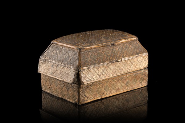 Cofanetto in paglia a due scomparti decorato da specchio e ad arte povera, cassettini nella fascia. Francia, secolo XVIII (difetti e mancanze)
