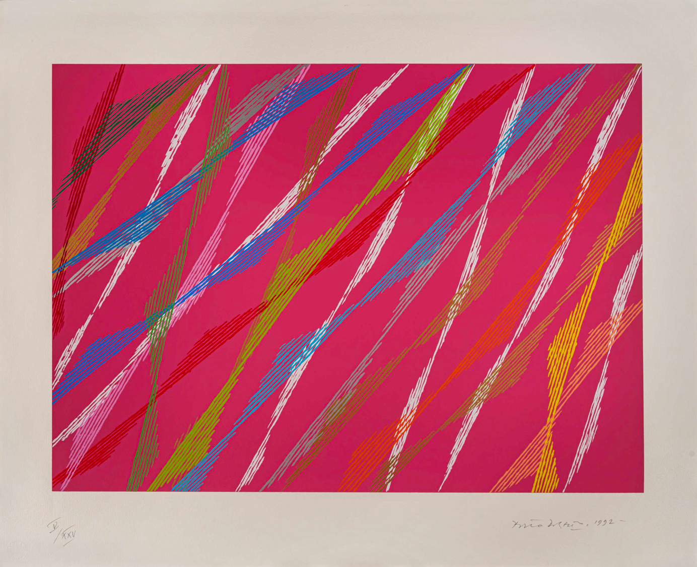 PIERO DORAZIO(1927 - 2005)Composizione1992Serigrafia, es. V/XXV73,8 x 90,4 cmFirmata e datata a matita in basso a destra, numerata in basso a sinistraPROVENIENZA:Collezione privata, Milano