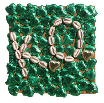 MONDINO Aldo Torino 1938 - Torino 2005 K.O., 2000 cioccolatini su tavola, cm. 30 x 30 Firma, data 'Mondino, 2000'; etichetta della Galleria Carlina, Torino (al retro) Autentica dell'Archivio Aldo Mondino, con n° 20071019124824, in data Milano, 24/10/2007