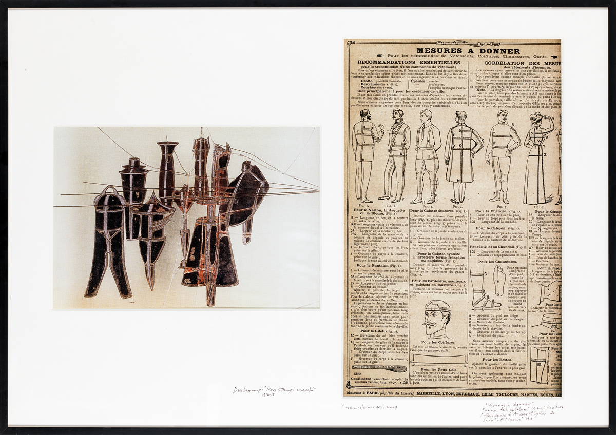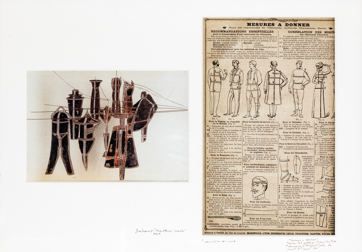 Le due fotocopie si riferiscono rispettivamente all'opera "Nove stampi maschi" di Marcel Duchamp del 1914-1915 e alla pagina "Mesures a donner" estratta dal catalogo Manifacture Francaise d'Armes et Cycles de Saint-Etienne del 1913