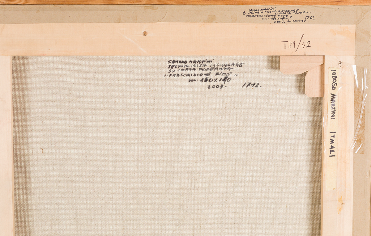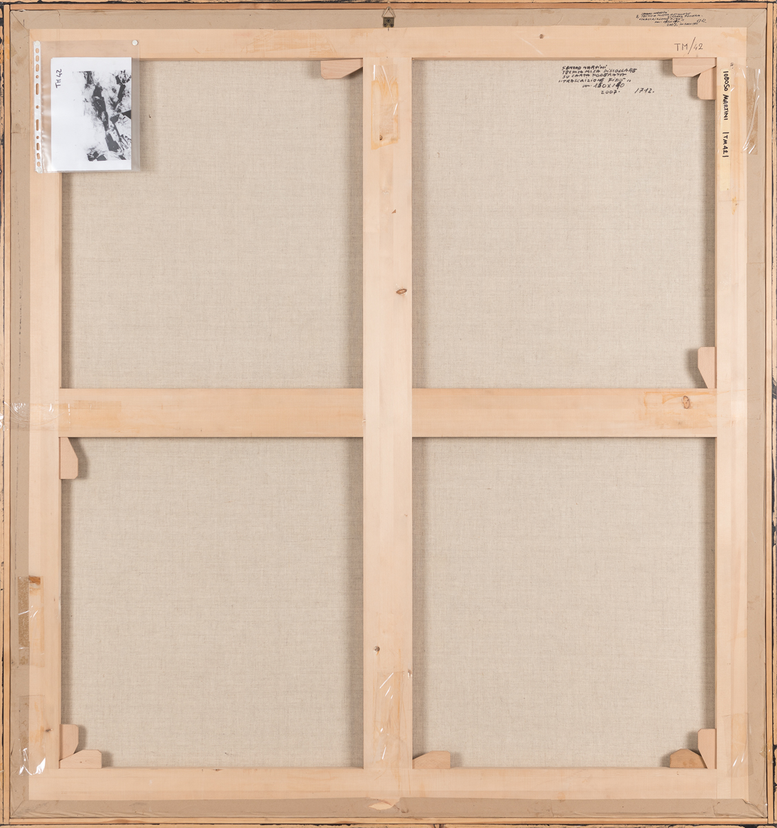 Firma, titolo, datazione, tecnica, misure e numero di repertorio al retro sulla tela e sul telaio