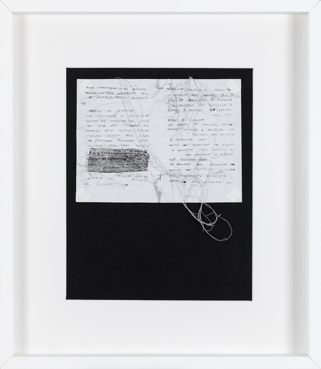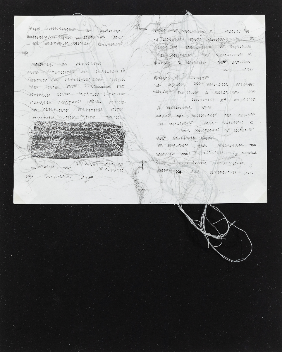 L'opera è una xerografia di una doppia pagina cucita con interventi in filo grigio