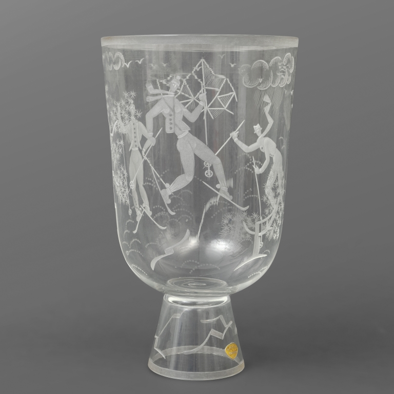 'Tre Sciatori' vaso in vetro cristallo inciso alla moletta anni '30.