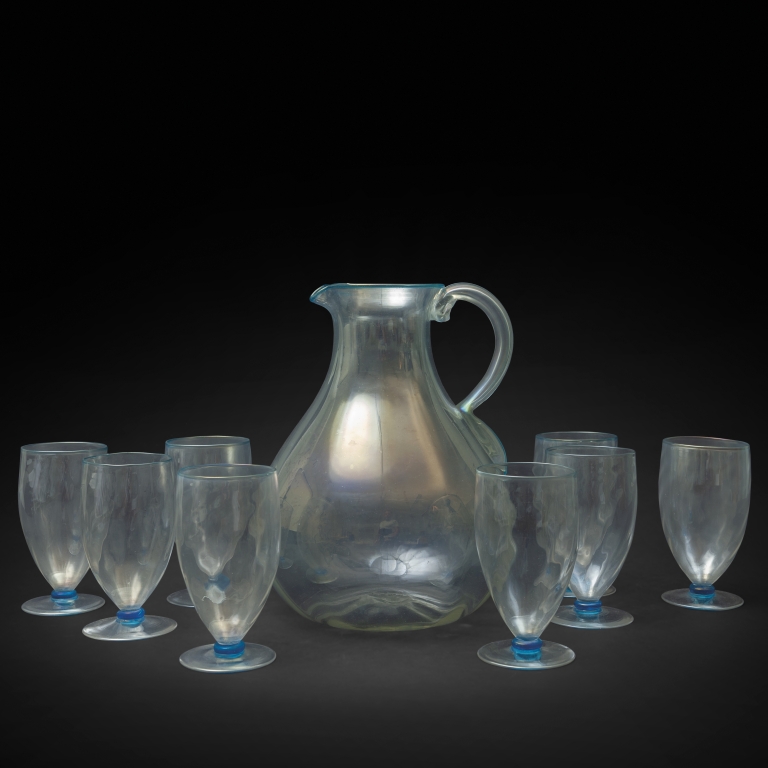 Una brocca con 8 bicchieri in cristallo iridato e orli in azzurro circa 1930.