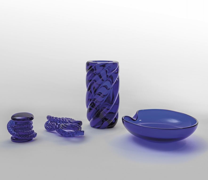 Un vaso una fune una bitta e una coppa in vetro blu circa 1980.