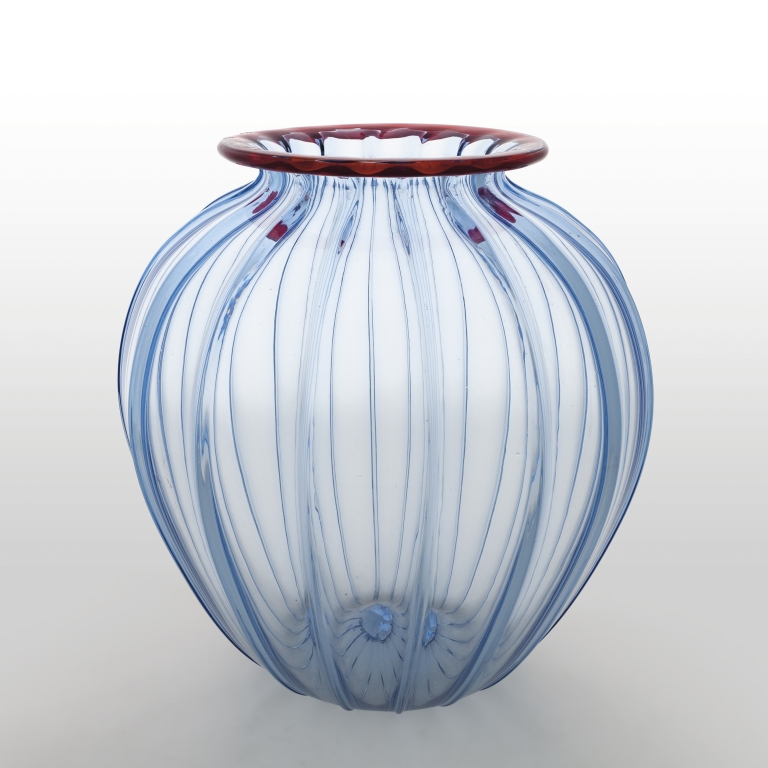 Un vaso costolato in vetro soffiato bluino con bocca bordata di vetro rosso circa 1930.