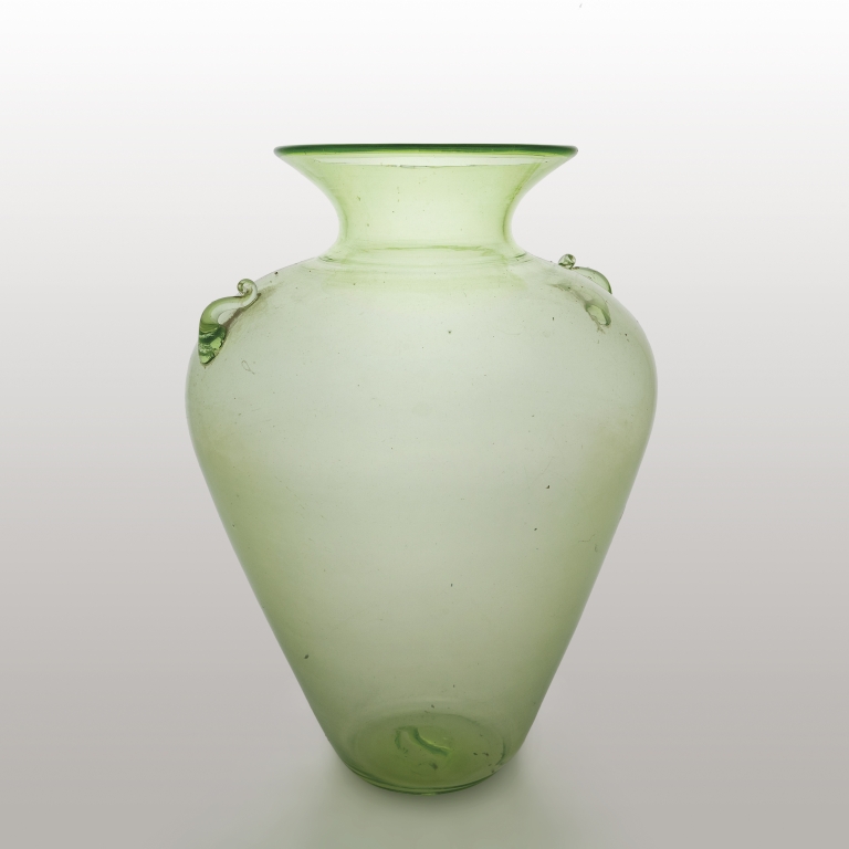 Un vaso in vetro trasparente verdino con due ansette circa 1925.