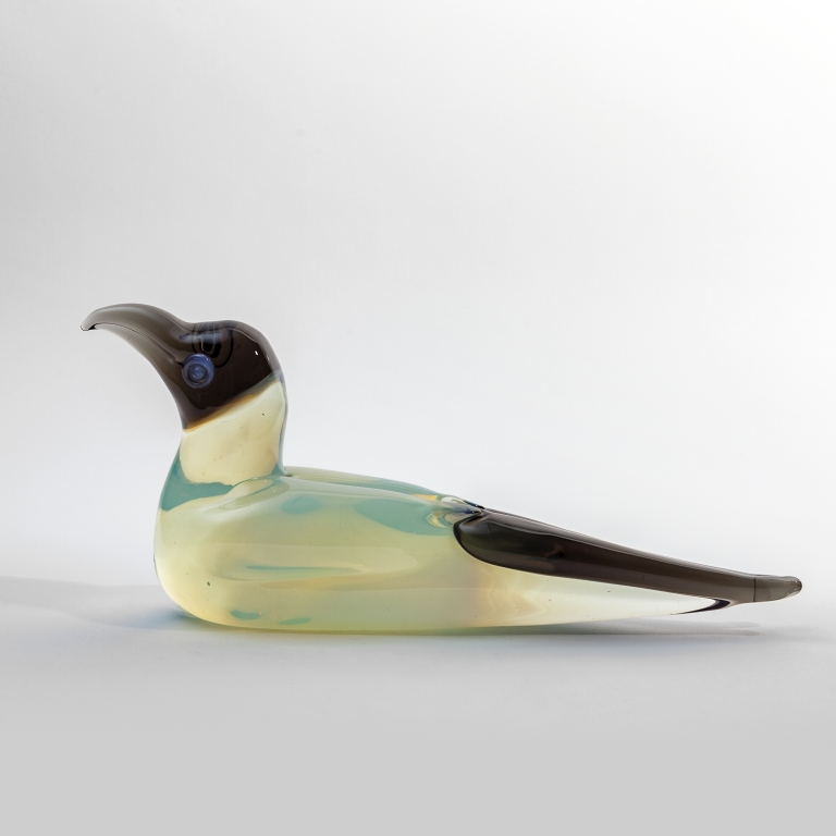 Gabbiano in vetro opalino con testa e ali in vetro fumè modello 9602 1954.