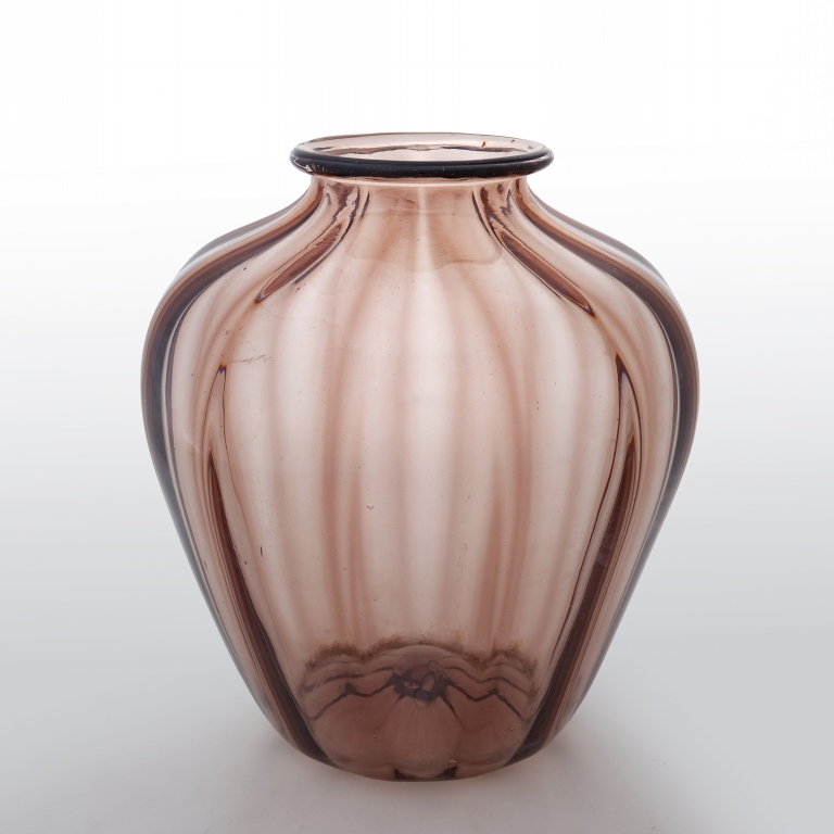 Un vaso costolato in vetro soffiato trasparente ametista.
