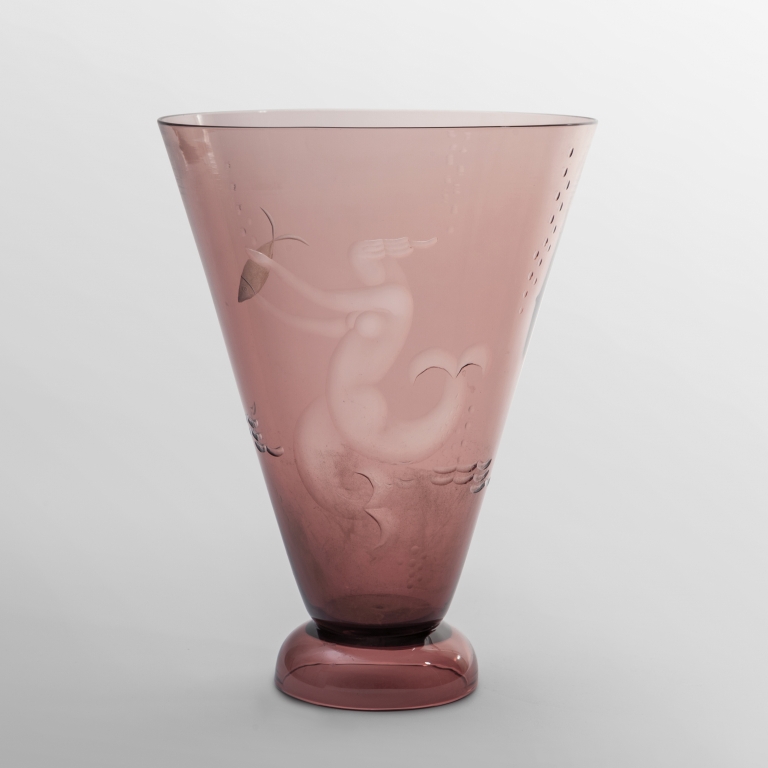'Preda' vaso inciso in vetro ametista con sirena che stringe pesce circa 1932.