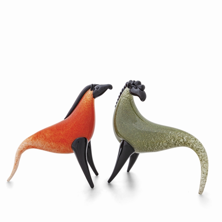 Vetro lattimo incamiciato con applicazione di polveri colorate.