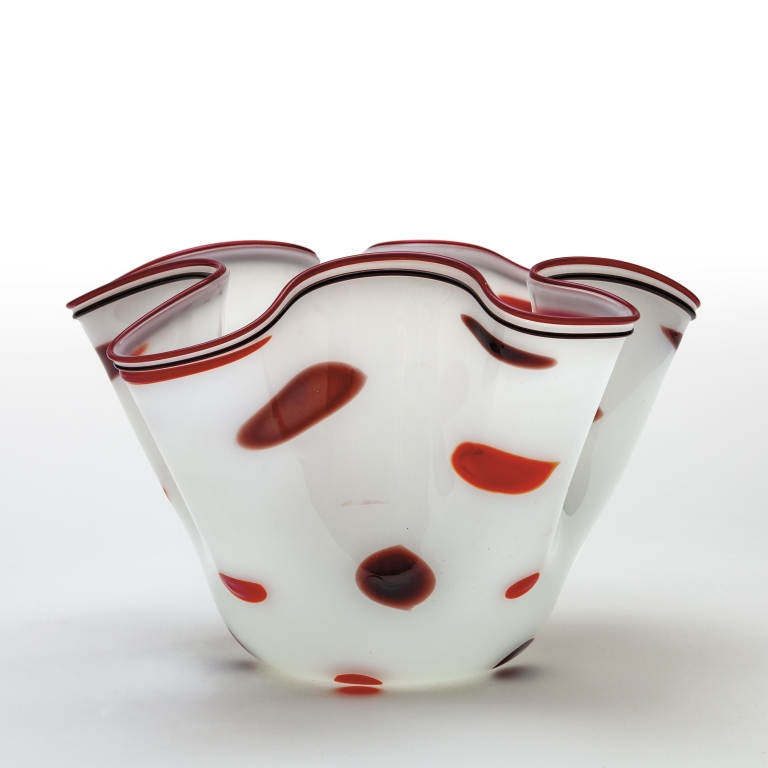 Un vaso fazzoletto in vetro lattimo con macchie e bordi ametista circa 1955.
