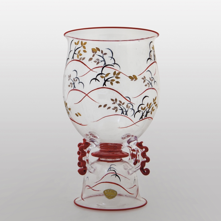 'Giardino' vaso in vetro incolore con profili e applicazioni in pasta vitrea rossa decorato a smalti anni '20.