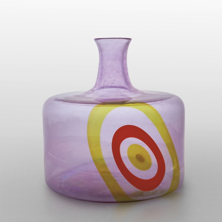 Un vaso in vetro iridato con grossa murrina bicolore circa 1970.