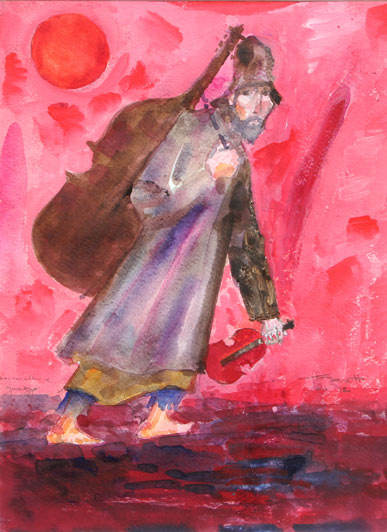 LONGARETTI Trento Treviglio 1916 Mendicante su fondo rosso, 2012 acquarello e guazzo su carta, cm. 36 x 26 Tecnica 'Acquarello e guazzo' (in basso a sinistra); firma, data 'T. Longaretti, 2012' (in basso a destra) Autentica dell'artista su fotografia