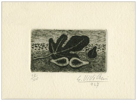 GIUSEPPE VIVIANI 1898 - 1965 Foglie e fichi 1947 Acquaforte su rame acciaiato es.28/325. Firma e data in b. a d. (8,6 x 11,2 foglio - 3 x 5,4 inc.) Lastra biffata. Opera facente parte della cartella “Sei incisioni di Giuseppe Viviani” con presentazione di Libero De LIbero, “All’insegna del Pesce d’Oro”, Milano, 1947. Tiratura: 325 es. numerati e firmati + 2 es. contrassegnati dalle lettere A e B + qualche es. di prova firmato su vari tipi di carta. Pubbl.:“Viviani Opera Incisoria Catalogo Generale” cat. a cura di Nicola Micieli, Editore Bandecchi & Vivaldi, Pontedera, 1998, tav.87, p.193.