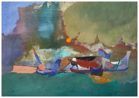 EUGENIO PARDINI 1912 - 2003 Immagine marinara 1975 Affresco su tavola 70 x 100. Firma in b. a d., data in b. a s.; sul verso titolo, tecnica, data e firma.